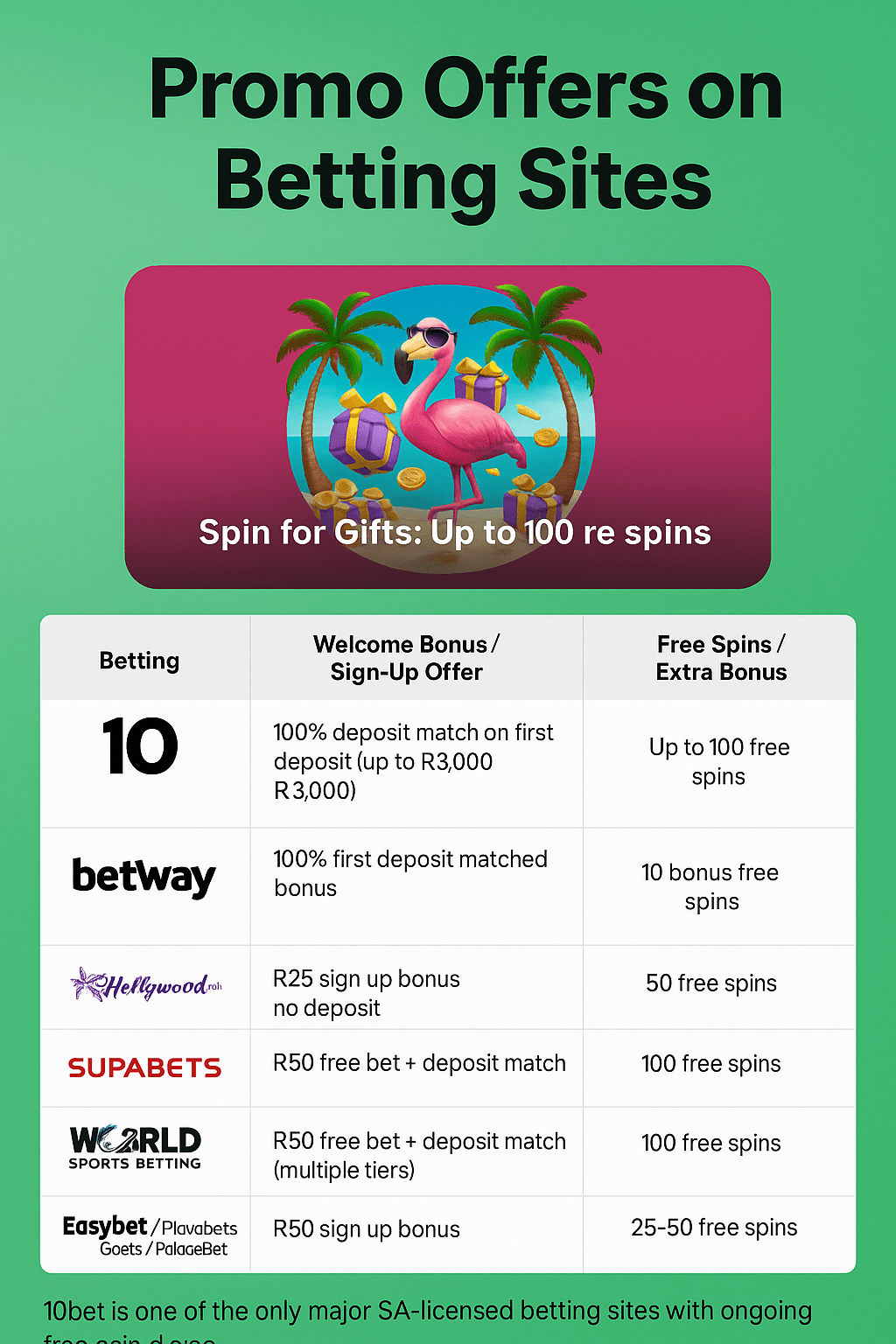The table highlights that 10bet is one of the only major SA-licensed betting sites offering ongoing free spin drops alongside a competitive sports welcome bonus, making it a strong match for users searching for both casino-style rewards and sport-focused sign-up value.
