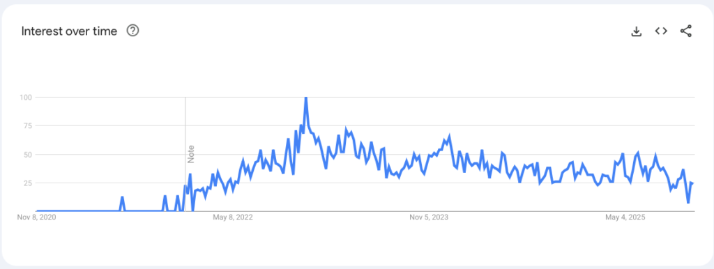 What stands out is the flat consistency. Searches sit between 25 and 55 almost every week.